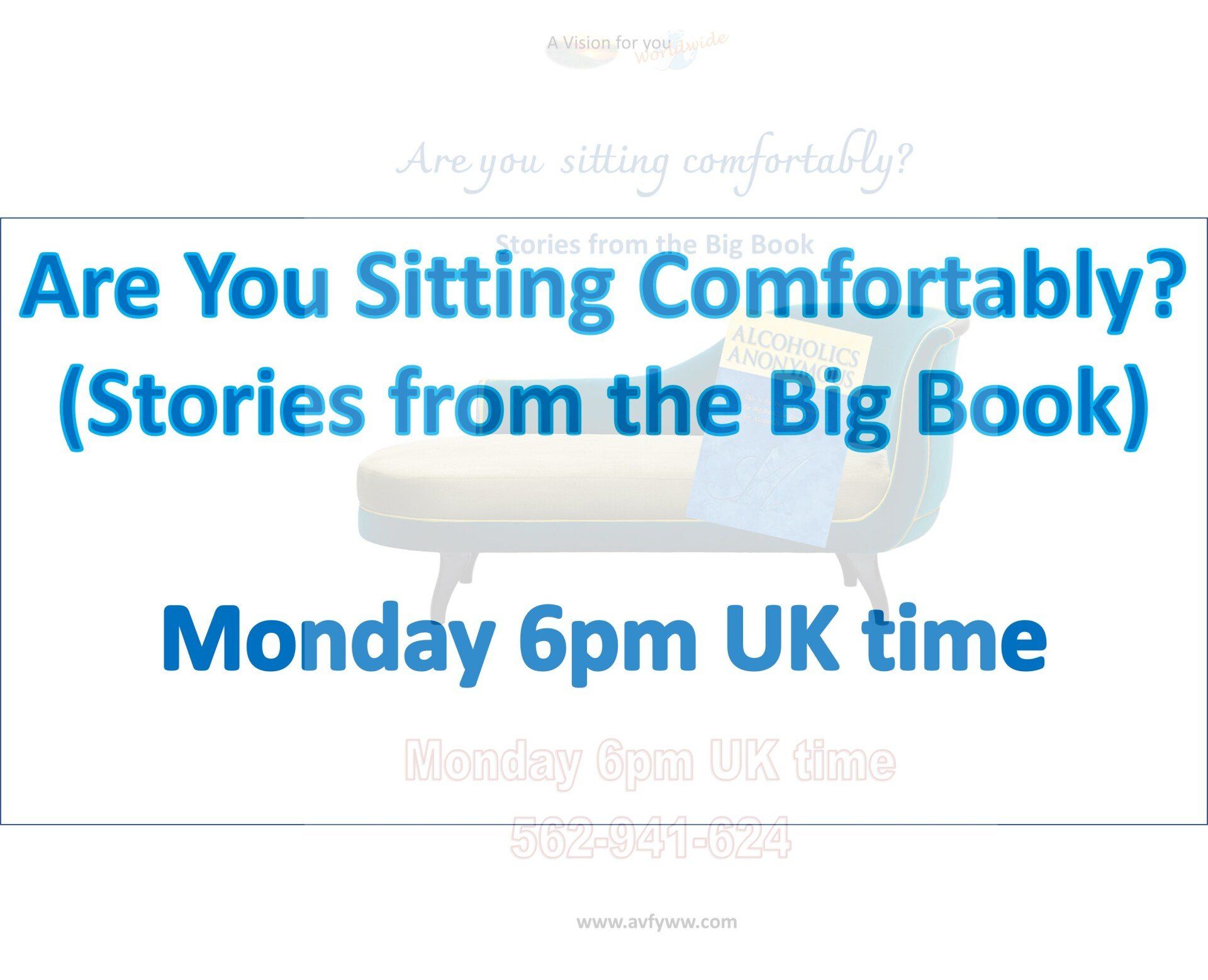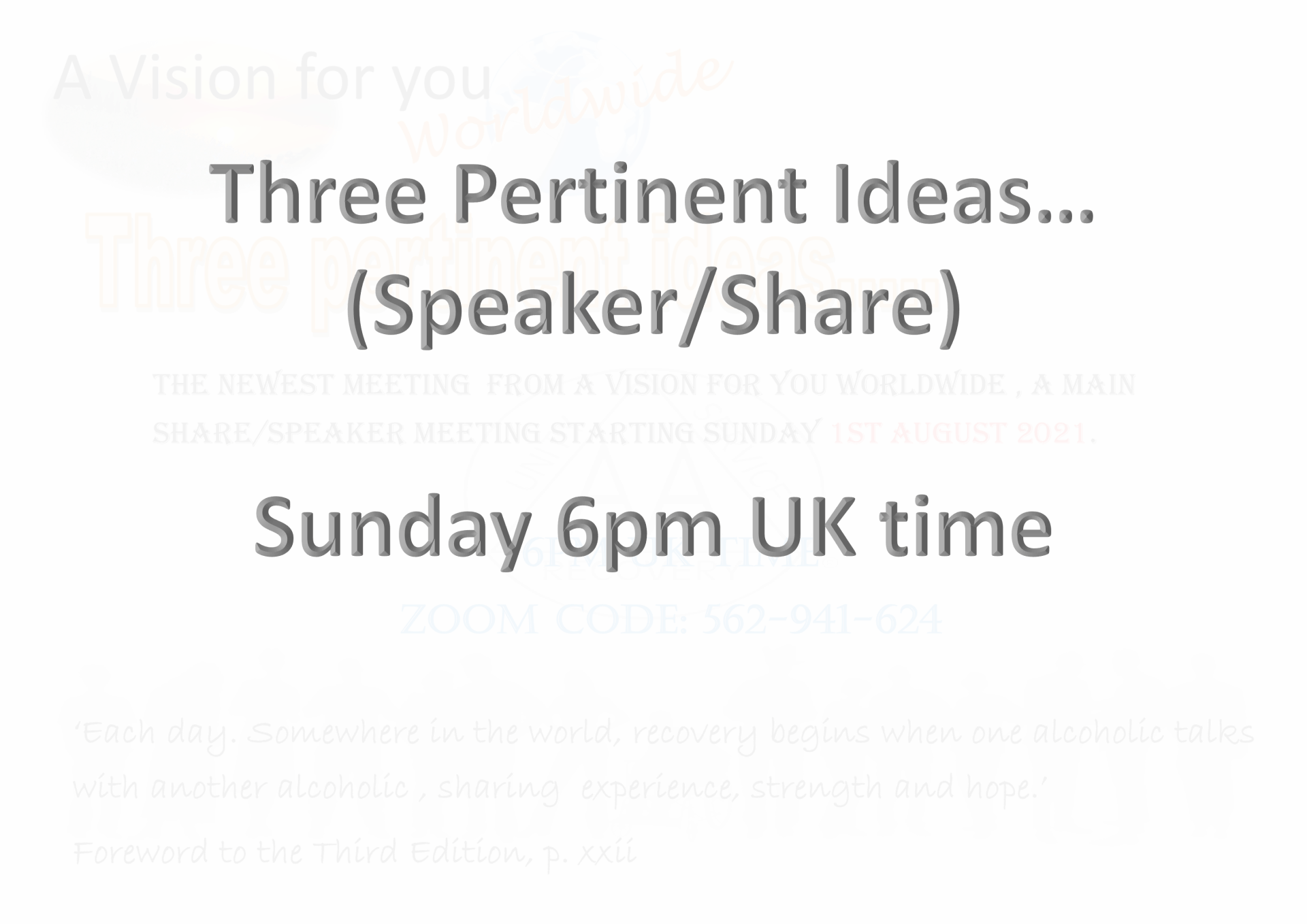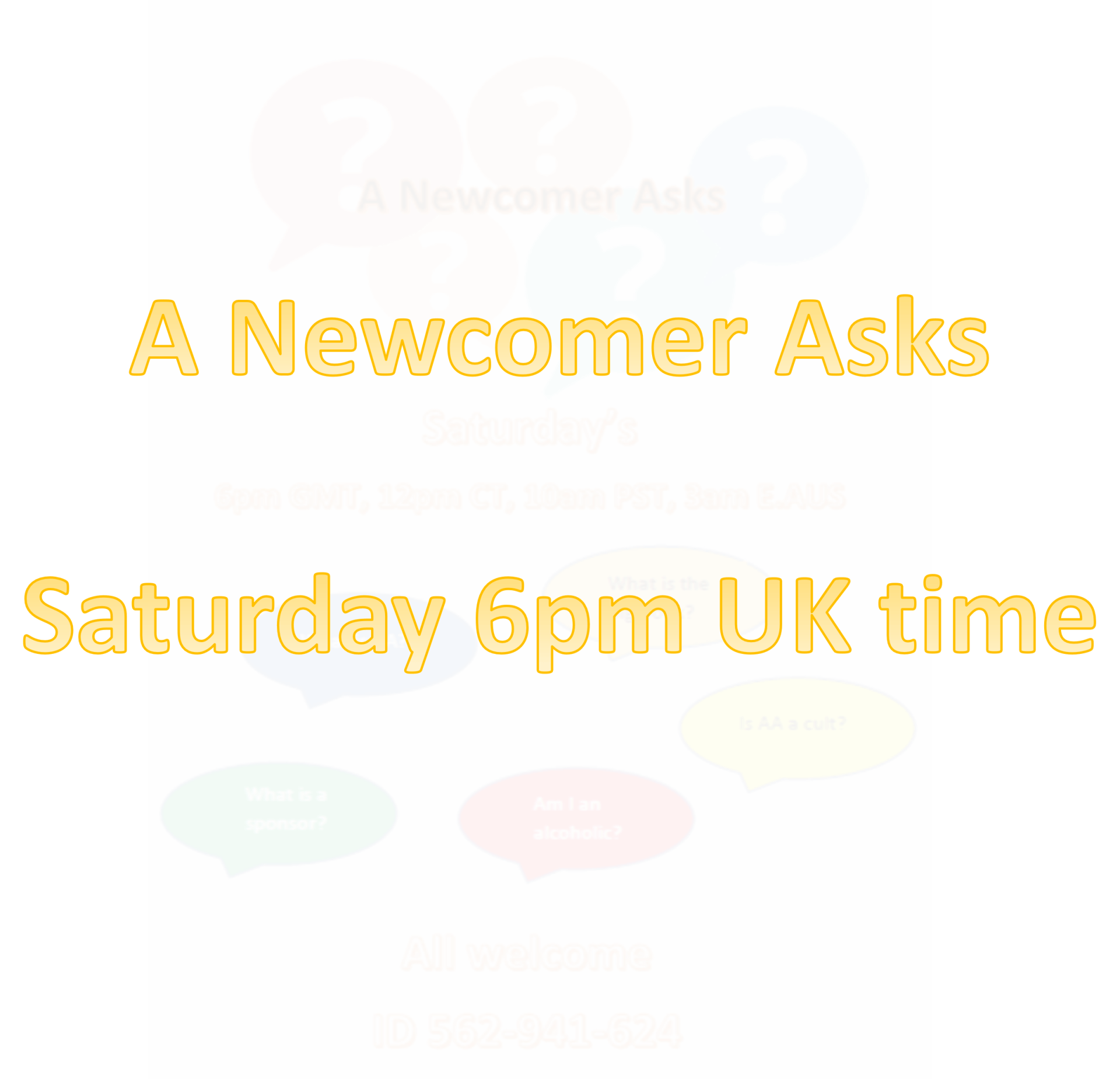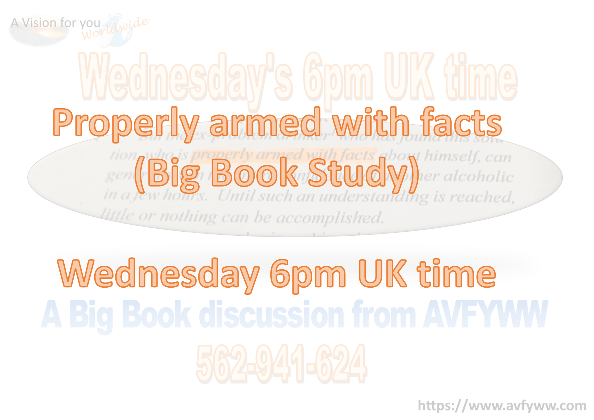 We now have a meeting every day at 6pm UK time with the addition of Three Pertinent Ideas, a main share/speaker meeting. Are you sitting comfortably? Big Book stories study and discussion and Properly Armed with Facts which is a Big Book discussion.